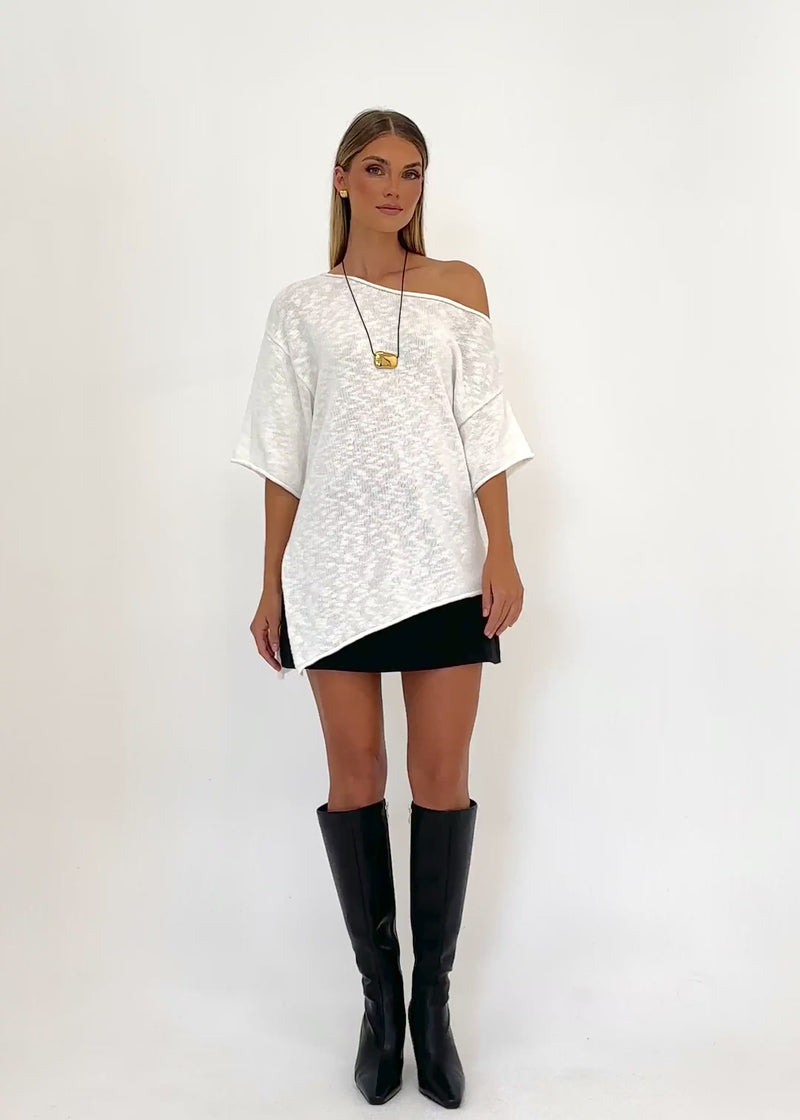 A true wardrobe staple, the Elea Drop Shoulder Knit Top - Off White pairs easily with everything from denim to tailored pants or printed skirts. Perfect for layering all year round.