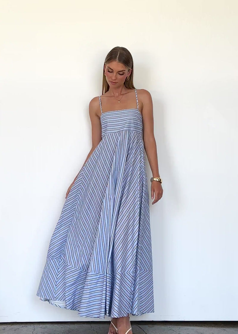 Holiday ready in the Elide Maxi Dress - Blue Stripe! Pair with espadrilles, a straw tote, or blazer for smart dinners. Add layered necklaces for extra flair. Perfect seaside or summer wedding vibes.
