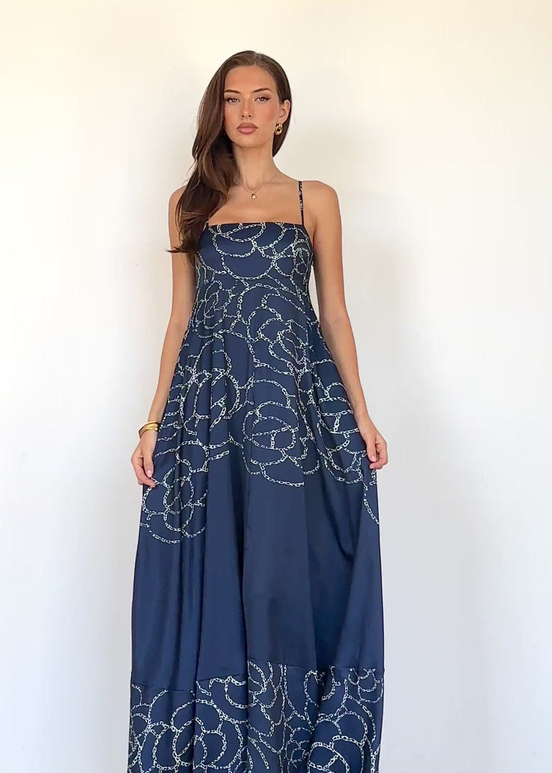 Turn heads in the Elide Maxi Dress - Navy Abstract at summer soirées or city strolls. Style with strappy sandals, a mini bag, and gold jewellery. Throw on a denim jacket for relaxed vibes.