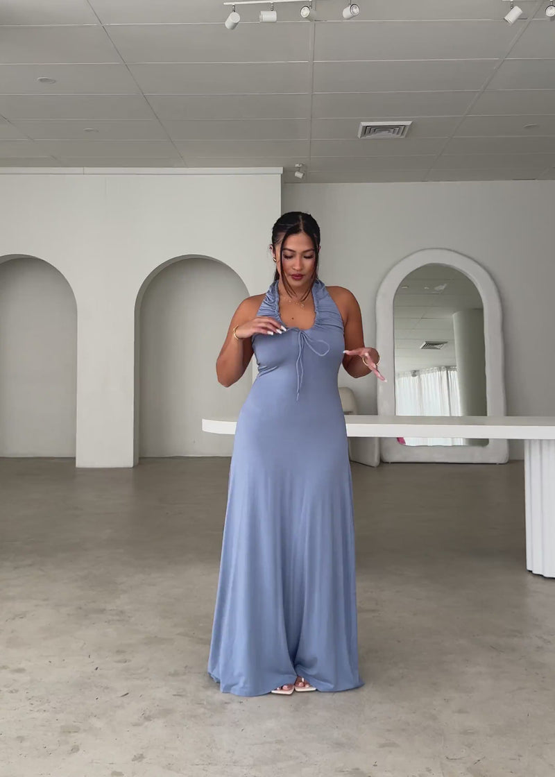 Bring quiet confidence to your look with the Erin Halter Maxi Dress in steel blue.