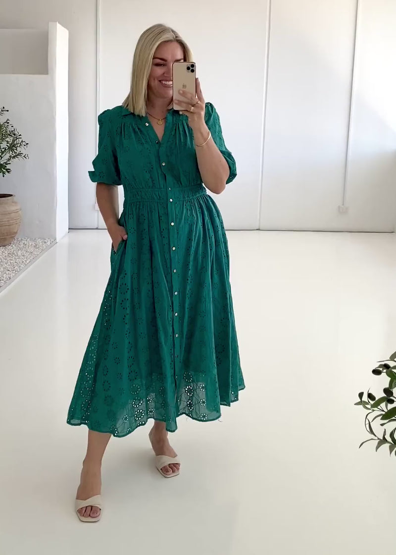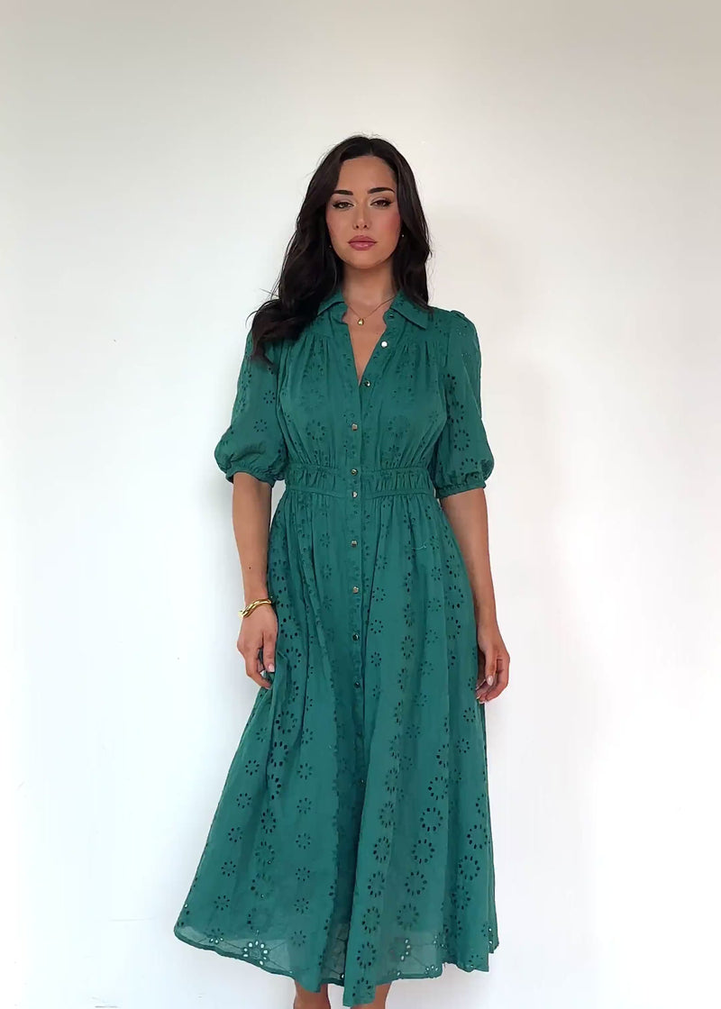 Vibrant and refined, the Eryn Midi Dress - Teal Anglaise adds effortless charm to any occasion. Ideal for brunch dates, resort escapes or evening drinks, it pairs beautifully with nude heels or woven slides. Its collared, mid-sleeve cut is perfect year-round.