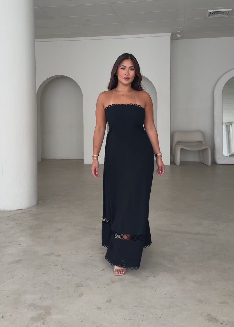 Sleek and versatile, the Fiorah Strapless Maxi Dress in black is your go-to for instant polish. Pair it with statement earrings and heels for a night out or keep it cool with slides and a mini crossbody.