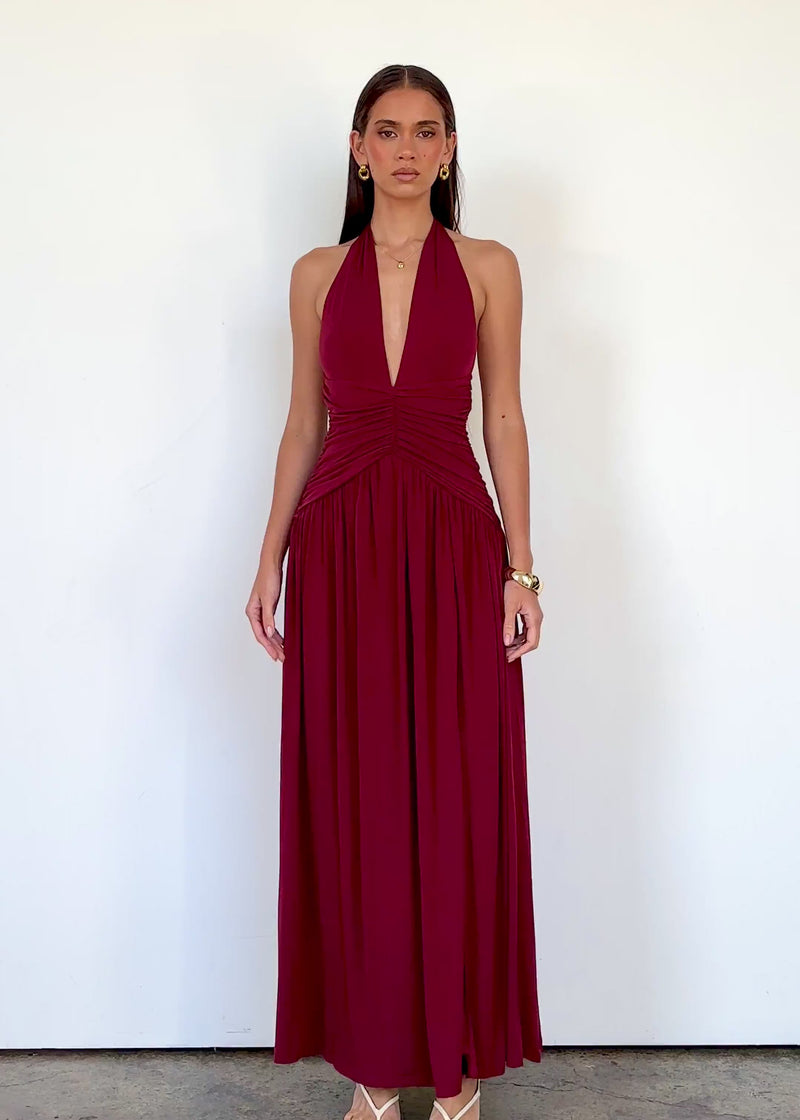 Turn heads in the Giana Halter Maxi Dress, a rich wine silhouette offering elegant drape and timeless evening appeal. Ideal for dinners, events and sophisticated outings.