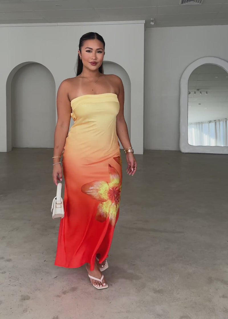 Soft, summery tones make the Jamie Strapless Maxi Dress – Sunrise Bloom perfect for brunches, holidays, and daytime celebrations. Style with wedges, a woven bag, and dainty jewellery.