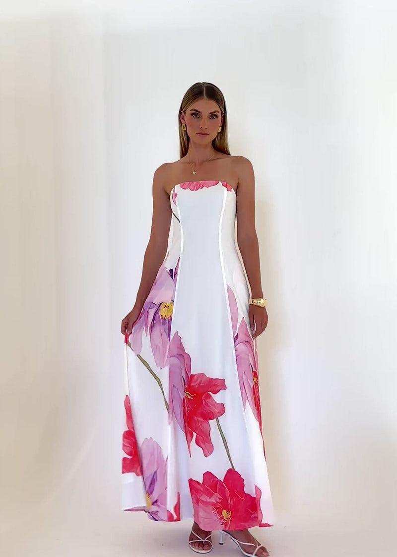 The Jayde Strapless Maxi Dress - Pink Flowers is made for sunny escapes—style with wedges and a sunhat for resort days or nude heels for evening glamour. A flattering strapless cut makes it a must-have for holiday wardrobes.