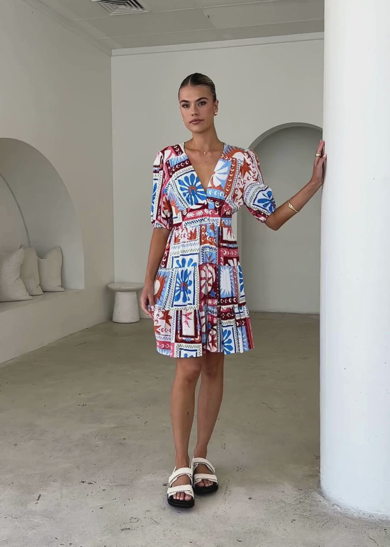 A classic yet modern piece, the Jaynie Dress - Blue Tile complements a high ponytail, gold hoop earrings, and wedges for a versatile and polished appearance. Accentuate the look with a bold clutch for added flair.