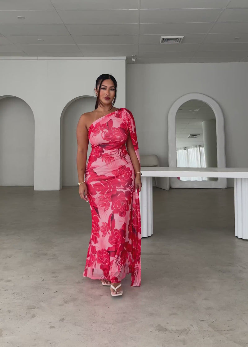 Make every entrance unforgettable in the Jenna One Shoulder Maxi Dress in red flowers.