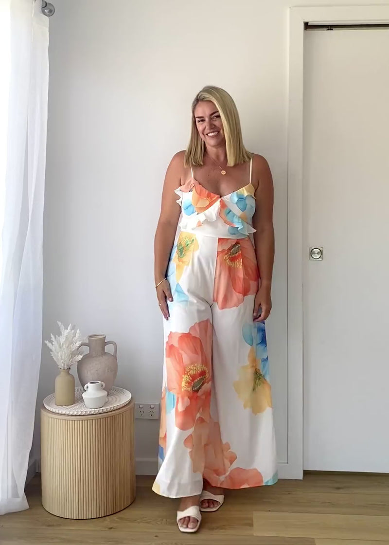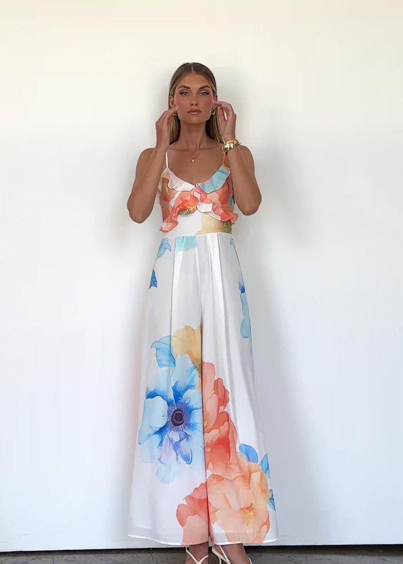 Turn heads in the Jessika Pantsuit, a bold mix of floral and flair. Style it with nude mules and a sleek ponytail for daytime events or add bold earrings for evening glam.