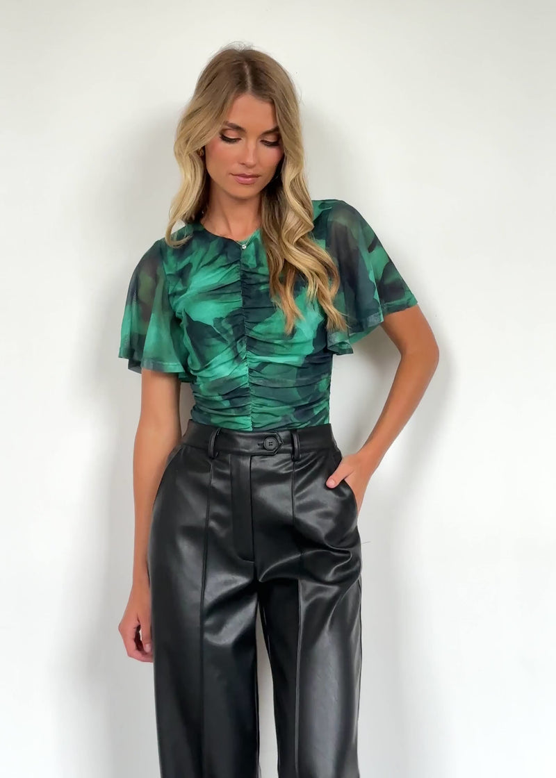 The Joey Mesh Top in Emerald Watercolour brings a fresh, artistic feel to any look. Wear it with high-waisted trousers and pointed-toe heels for a sleek dinner outfit, or keep it casual with denim and loafers for an effortlessly chic daytime look.