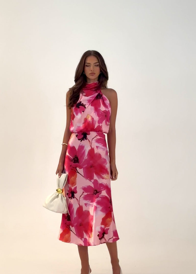 Playful and bold, the Joiss Maxi Dress - Raspberry Floral pairs with wedges and a clutch for evening plans or flat sandals for everyday charm. Its flowing cut and striking print make it a statement piece.