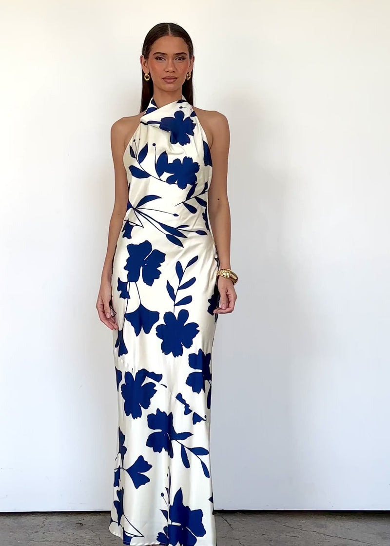 Turn heads in the Joslin Halter Maxi Dress, your go-to for summer events and weekend getaways. Its bold navy leaf print adds that breezy resort charm — pair with strappy heels and a woven bag for date nights or slides and sunnies for a coastal stroll.