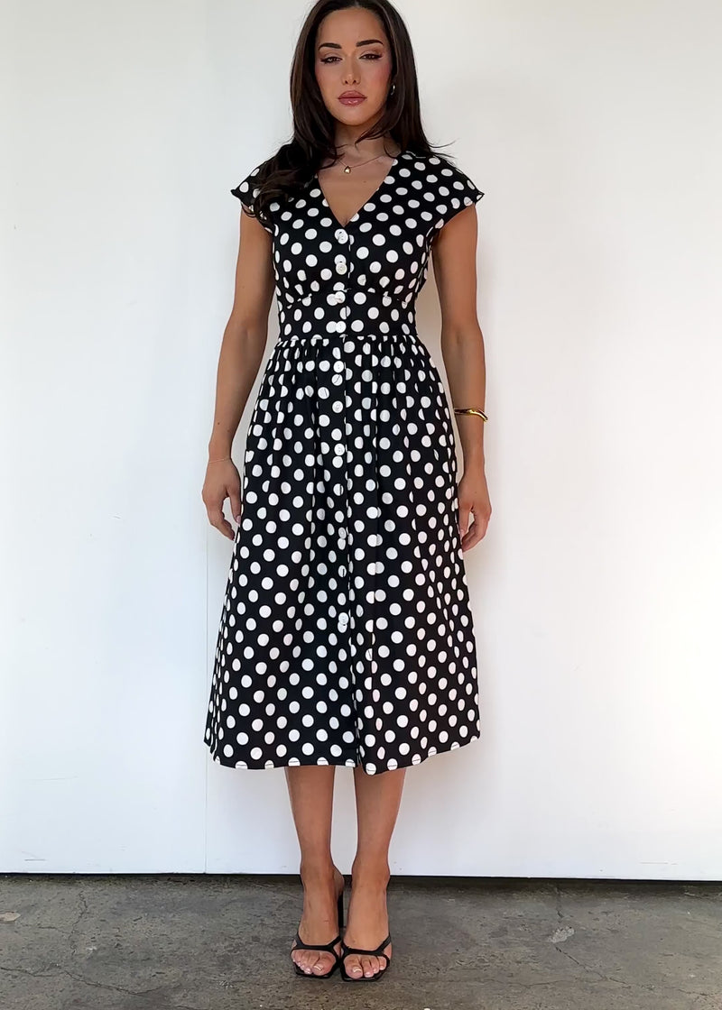 Own the night with the timeless charm of the Jovianne Midi Dress in black polka.