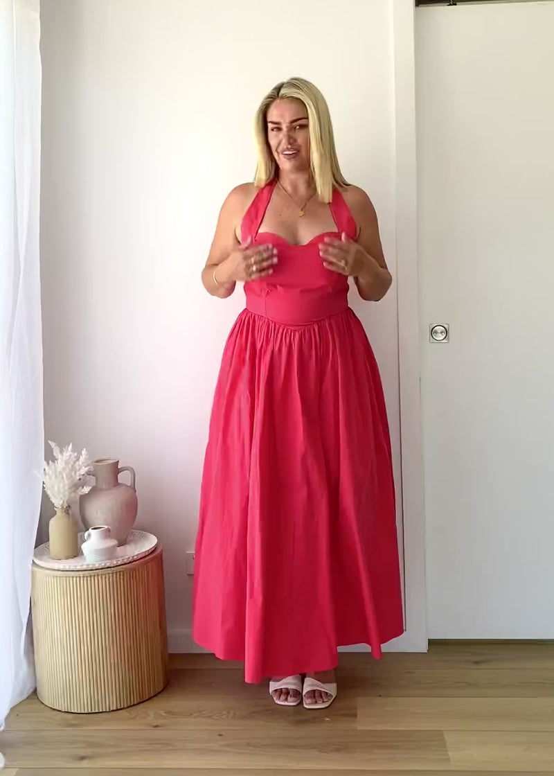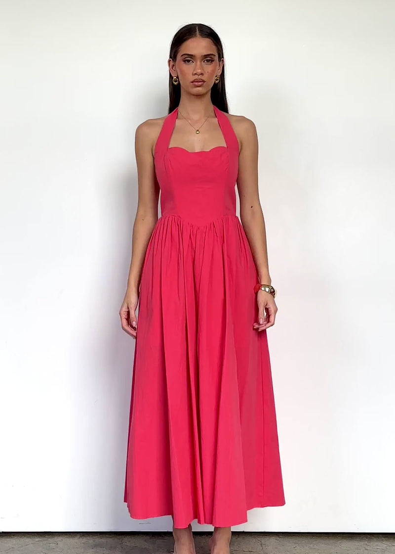 Turn heads in the Karley Halter Midi Dress in Scarlet. With its bold hue and feminine fit, it’s the ultimate show-stopper for cocktail parties or date nights. Team it with gold heels, a mini bag, and a soft updo for that classic yet playful energy.