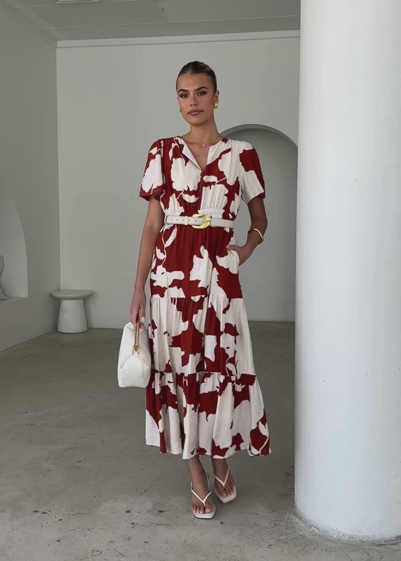 Bright and beautiful, the Katherine Maxi Dress in Red Floral is perfect for outdoor gatherings. Style it with a low chignon, a delicate necklace, and espadrille wedges for a timeless summer look. A rattan clutch completes the outfit with ease. Make this stunning dress yours—order now!
