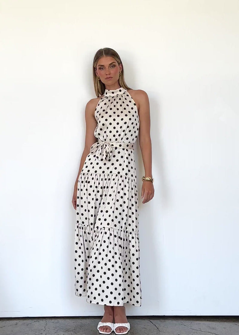 Soft, playful, and ultra-flattering, the Katrina Maxi in cream polka brings retro charm to your wardrobe. Pair with tan heels and gold accessories for a chic day-to-night look.