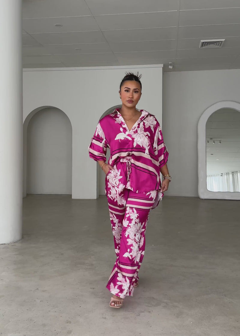 Make a bold statement with the Kaycie Pants in Magenta Floral. The flattering fit and lively print will elevate your look, whether you're pairing them with the matching Kaycie Shirt for a chic set or mixing it up with a neutral top for balance.