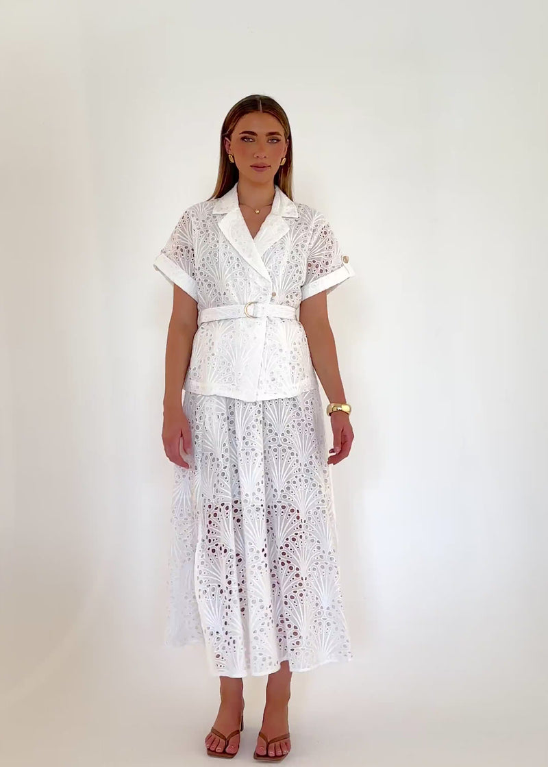 Soft and breezy, the Kaylee Maxi Skirt – White Anglaise suits brunch dates, picnics, or sunny getaways. Style with the matching shirt or a simple cami and sandals. Add to cart and enjoy effortless, coordinated summer styling.