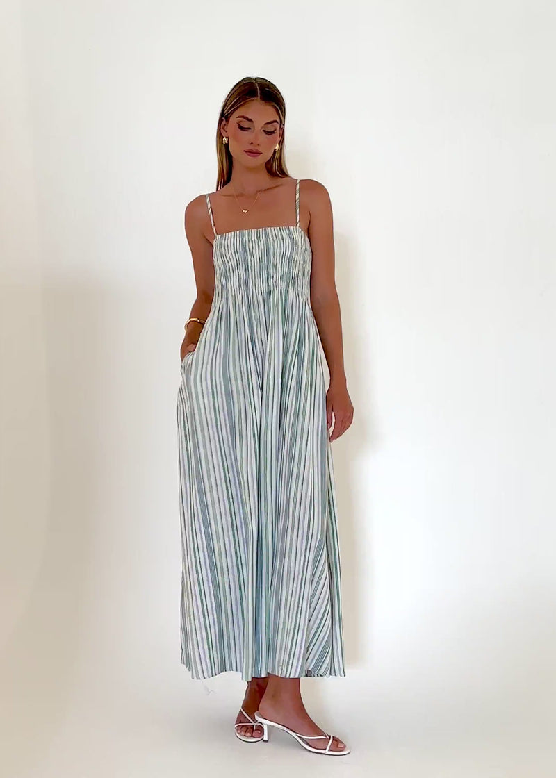 Feel effortlessly elegant wearing Keagan Maxi Dress - Agave Stripe for seaside dinners. Pair with neutral slides and a simple bag for a polished look. You will stay comfortable throughout a warm season. A timeless pattern and flowy silhouette are ideal for garden drinks. You will adore a striped look.