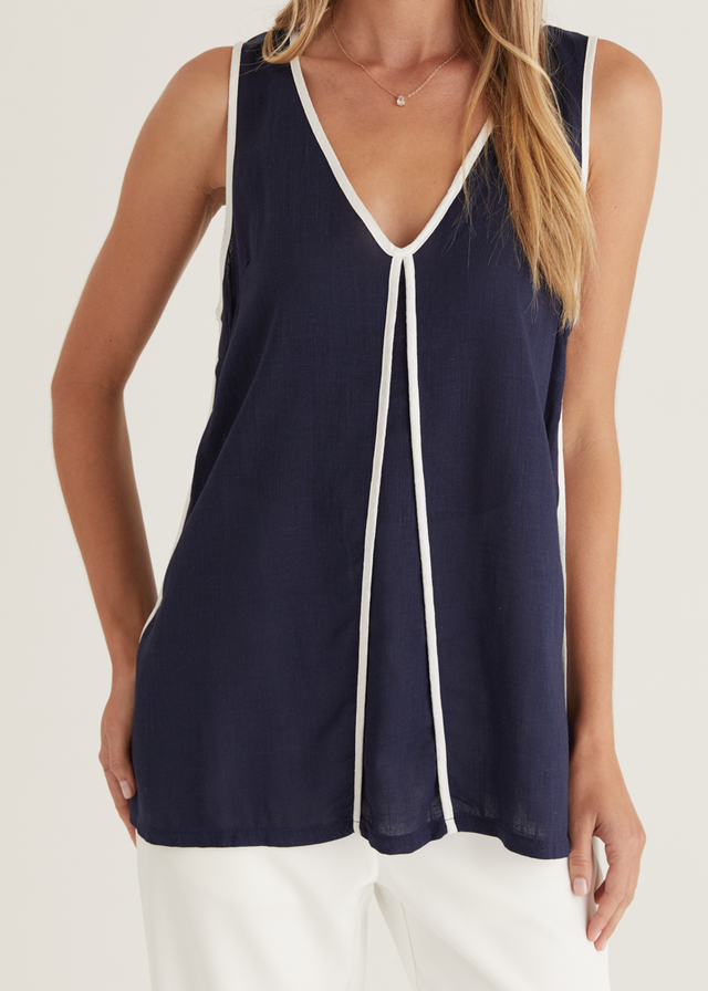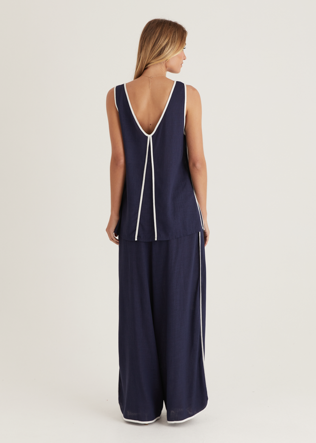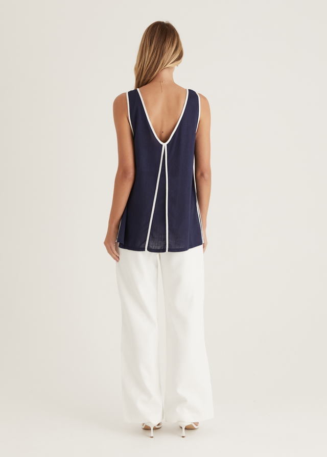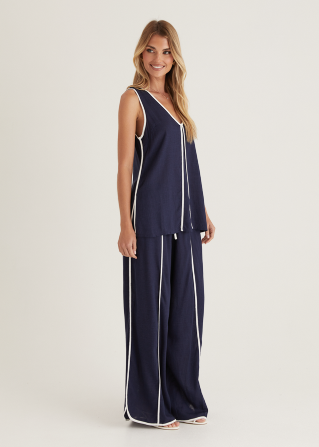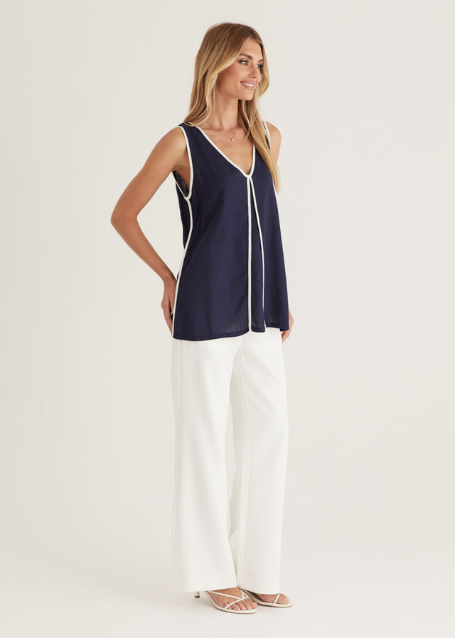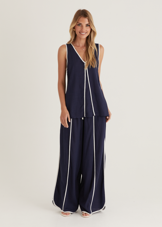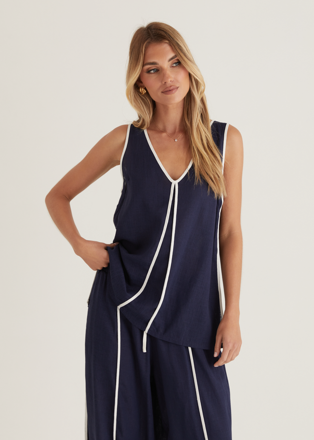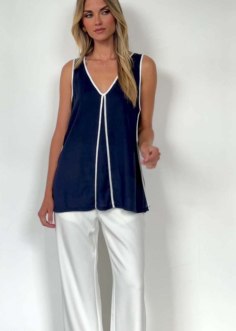 Elevate your casual look with the Kennedy Top in Navy. Pair it with the matching Kennedy Pants and loafers for a sleek ensemble. Style your hair in a sleek bob and accessorise with a statement watch and a satchel bag.