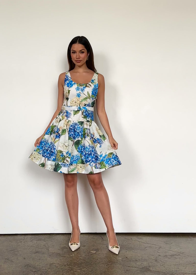 Soft blue blooms meet easy elegance in the Kiele Dress in blue hydrangea. Pair with espadrilles for daytime ease or metallic heels for party mode. Accessories? Just gold hoops and a mini bag.