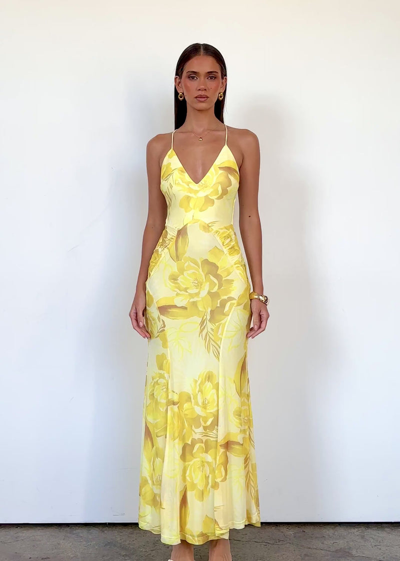 Float through the season in the Kimberley Mesh Maxi Dress, a lemon bloom vision layered in soft mesh and delicate florals. Perfect for warm-weather celebrations and special occasions.