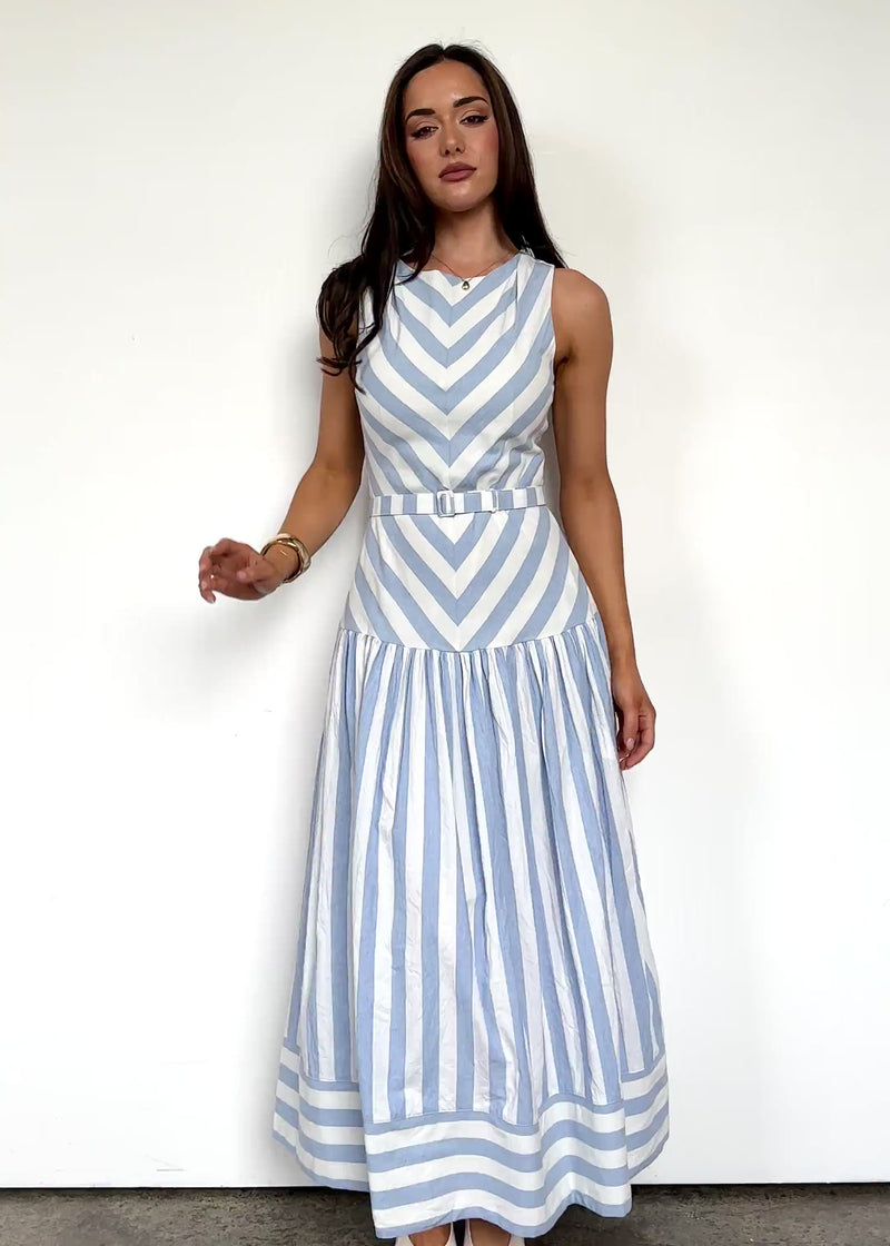 Keep it versatile with the Kingston Midi Dress in blue stripe.