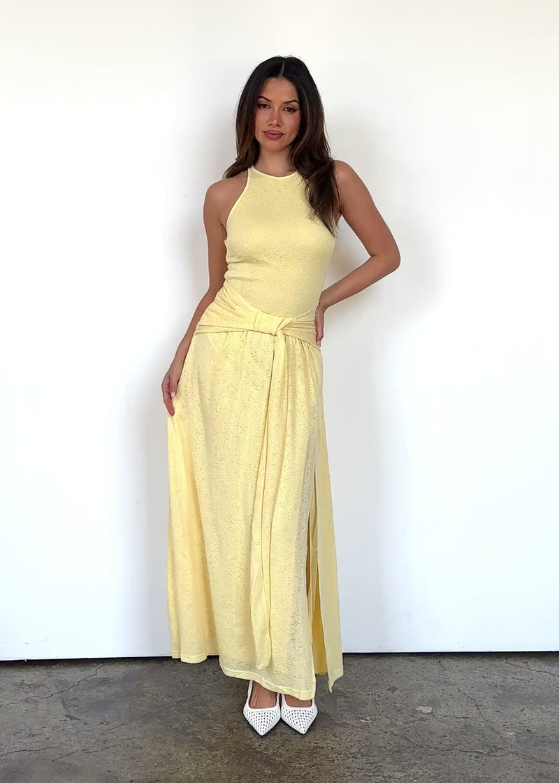 Radiate sunshine in the Kirria Knit Maxi. Its flowy silhouette and pop of yellow make it perfect for weekend strolls or brunch dates. Pair with tan sandals, a woven bag, and gold hoops for that easy summer glow.