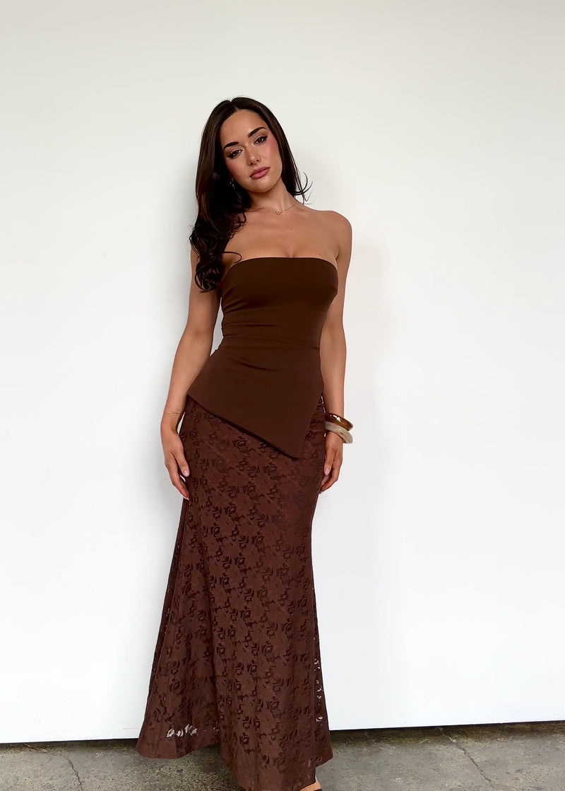 Step into sleek sophistication with the Kourtney Set - Cocoa. The strapless asymmetric top balances beautifully with the lace-detailed maxi skirt, giving you an effortless mix of modern edge and timeless elegance. Pair it with strappy heels, a box clutch, and statement earrings for weddings, evening soirees, or cocktail nights.