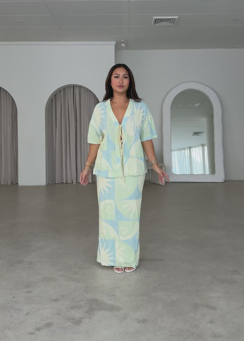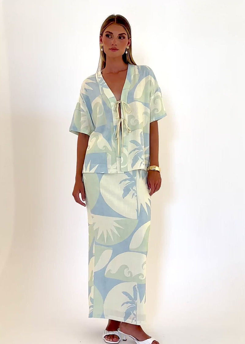 Flow through sunny plans in the Labyrinth Maxi Skirt – Coastal, ideal for beach walks, long lunches, or holiday evenings. Pair with the matching Labyrinth Tie Top or a simple cami, plus sandals and gold accents.
