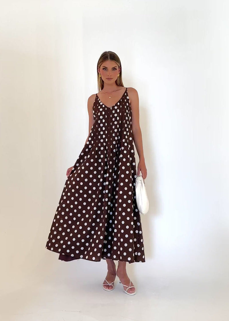 Sweet with a classic twist, the Latiana Maxi Dress – Brown Polka Dot suits brunch dates, picnics, and casual celebrations. Style with neutral heels and a mini bag for easy charm. Add to cart and let polka-dot style do the talking.