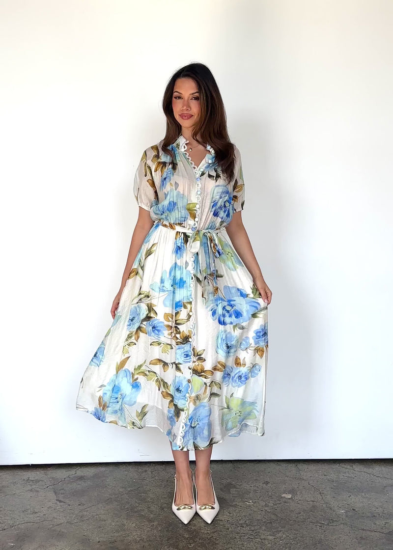Charming and classy, the Lauretta Midi Dress brings the perfect balance of relaxed and refined. Its blue floral print and soft silhouette make it ideal for brunches or casual events. Pair with nude heels and a woven bag for that laid-back polish.