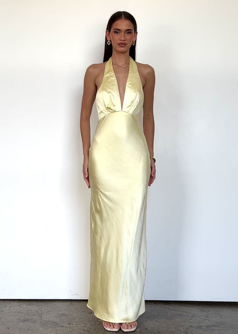 Serve effortless glamour in the Leala Halter Maxi Dress in Champagne. Team with metallic heels and layered jewellery for cocktail hour.