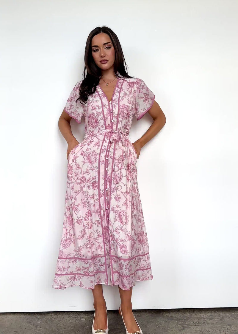Turn every outing into a picture-perfect moment with the Lindsey Midi Dress in pink floral.