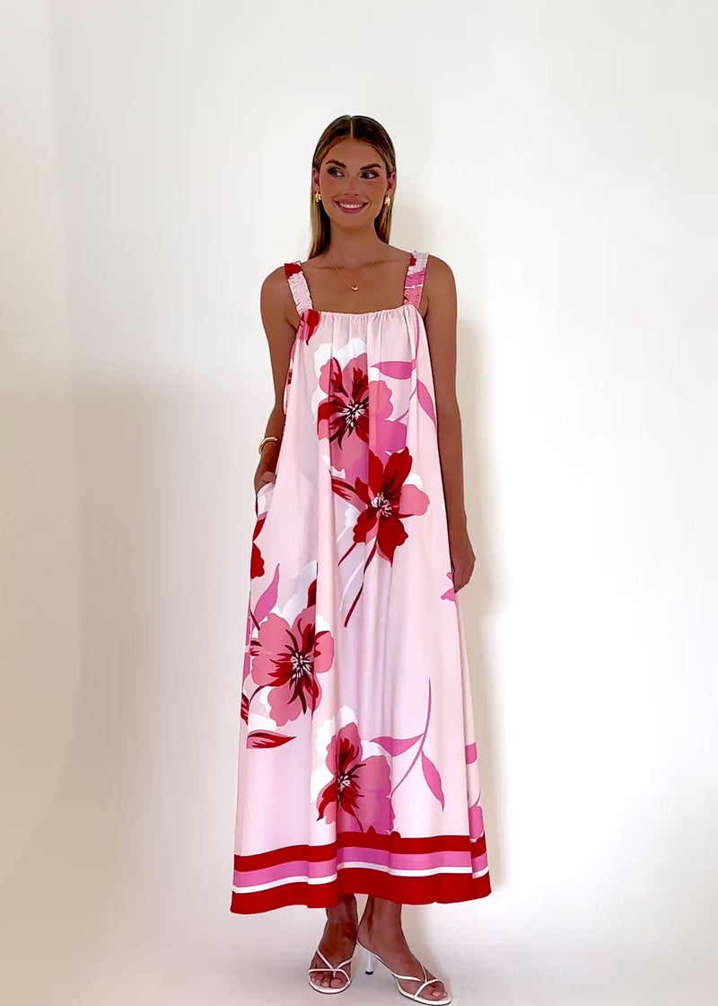 Bloom this season wearing Linette Maxi Dress - Strawberry Bloom to outdoor events. Match a gorgeous floral print with simple jewelry and sandals for a romantic vibe. Pair with Lina Off Shoulder Maxi Dress for a bridesmaid theme. You will love a feminine touch for brunch or a sun-drenched holiday afternoon.