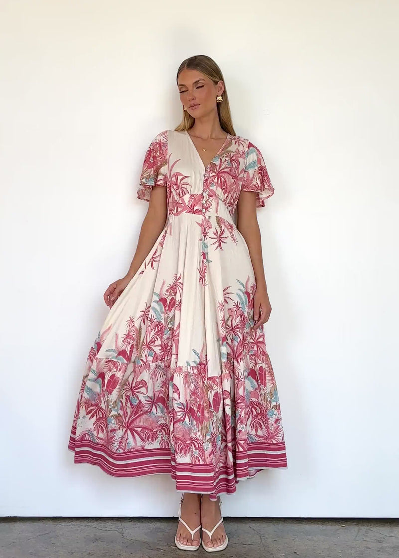 Tropical and laid-back, the Liyana Maxi Dress in berry palms is your go-to holiday piece. Style with bangles and flat slides for beach days or dress it up with wedges and a clutch for dinner by the water.