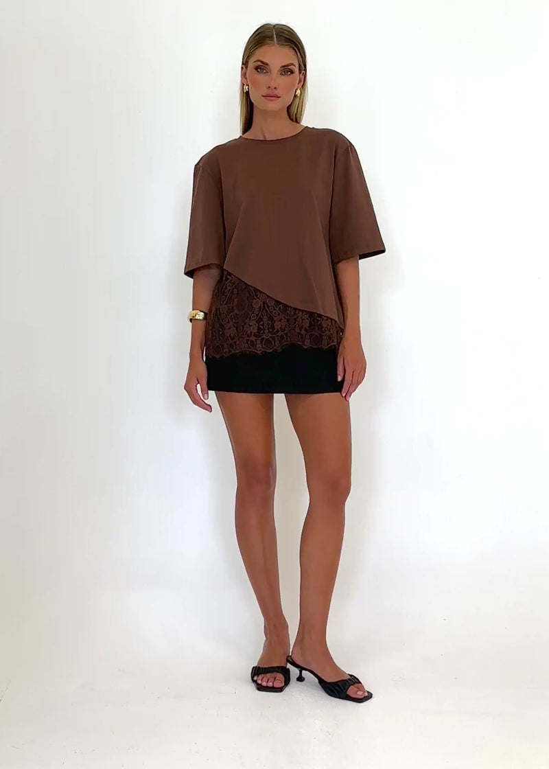 Soft and feminine, the Lolana Lace Splice Top – Chocolate pairs perfectly with denim, tailored pants, or skirts for day-to-night wear. Ideal for dinners, brunches, or casual evenings.