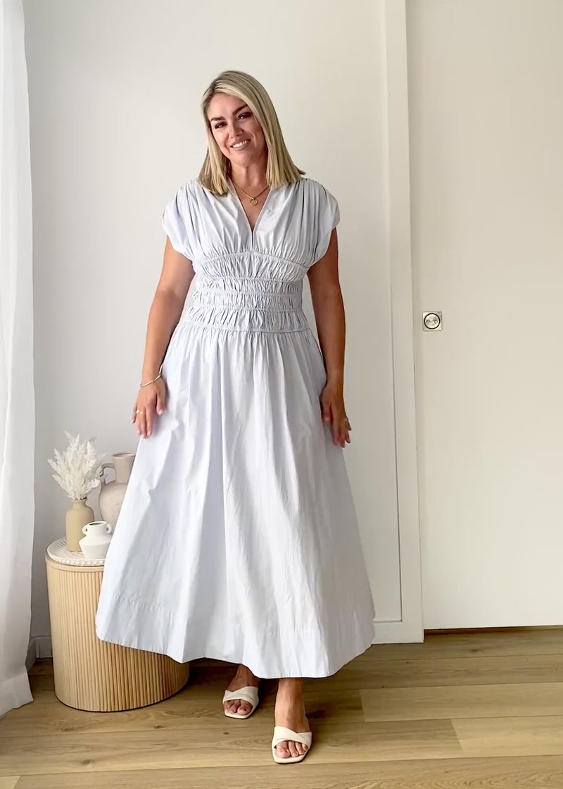 Breezy and elegant, the Lorriene Maxi Dress in baby blue is a must for seaside dinners or warm evenings. Slip on strappy sandals and gold hoops for a dreamy finish.