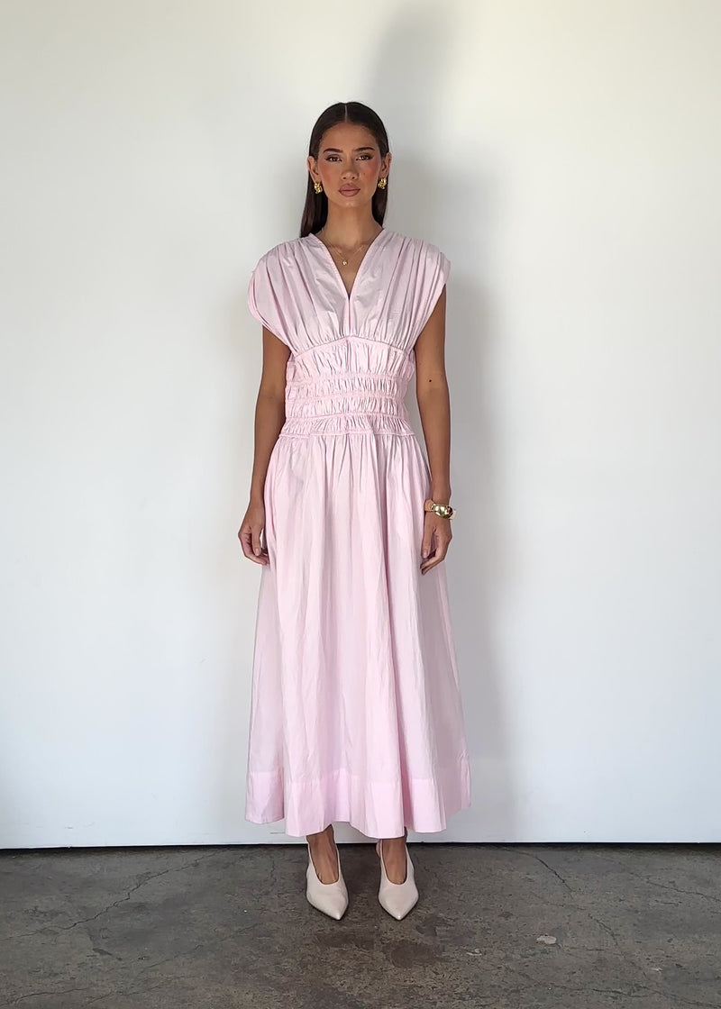 Soft pastel charm comes alive in the Lorriene Maxi Dress in baby pink. Pair with neutral heels and a woven clutch for that understated romance.