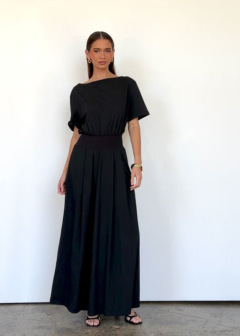 Serve timeless elegance in the Lucci Drop Shoulder Maxi Dress – Black. Pair with gold hoops, heeled mules, and a slick ponytail for that effortless edge.