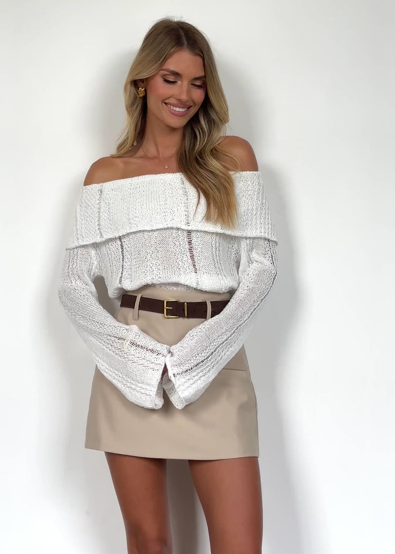 Stay warm and on-trend with the Lucy Off Shoulder Sweater in Off White. Pair it with a maxi skirt or wide-leg pants, layered necklaces, and a structured tote. Just right for relaxed catch-ups or office days.