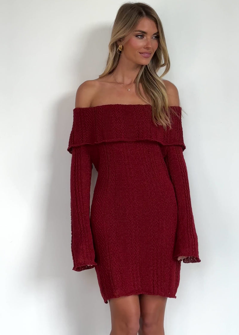 Say hello to your new favourite date-night dress. The Luna Off Shoulder Knit Dress in Maroon flatters with its close fit and soft texture. Pair with heeled boots, a mini bag, and statement studs for a polished evening look.