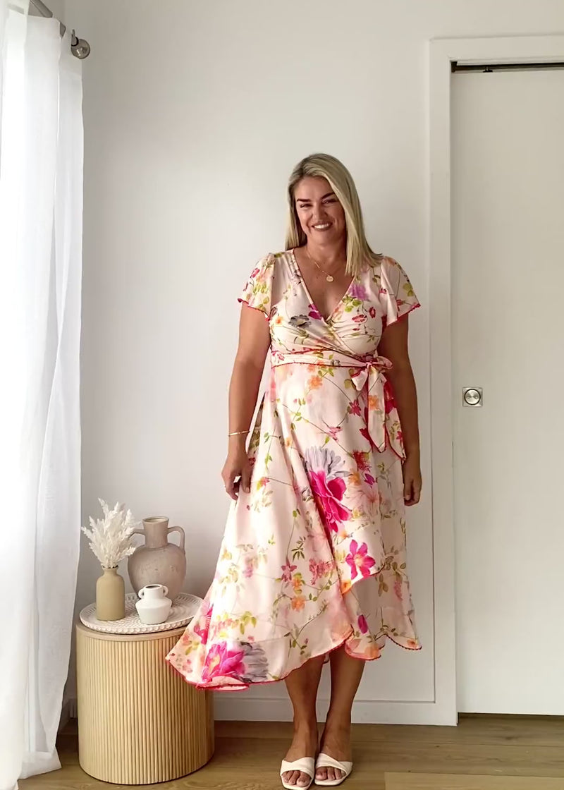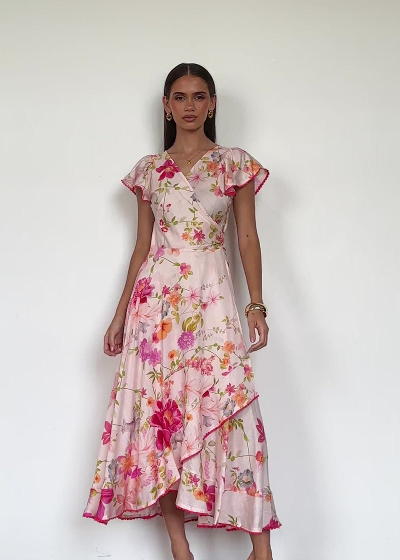 The Lyle Wrap Midi Dress – Pink Floral brings effortless charm to weekend catch-ups, lunches, and summer outings. Pair with strappy heels and a clutch for an easy feminine look.