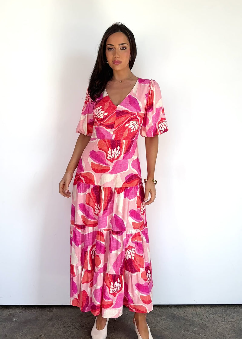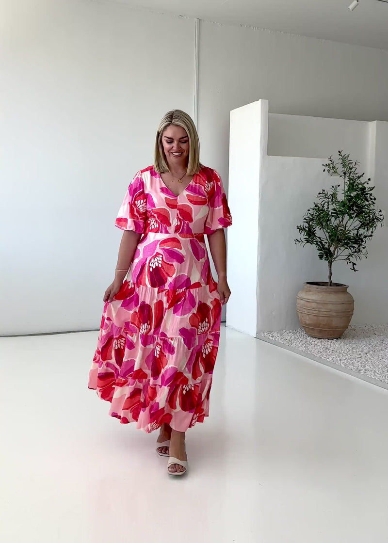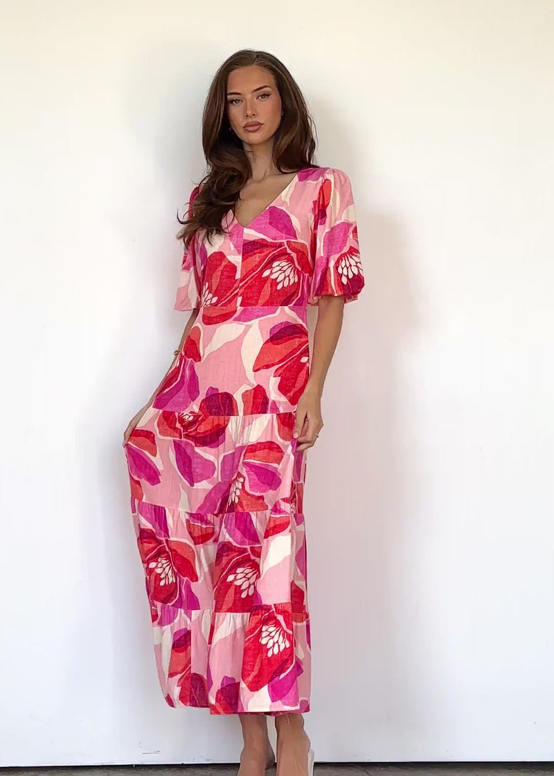 Romantic and flowy, the Lyndia Maxi Dress - Pink Rosalie works beautifully with nude heels and a clutch for weddings, or with flat sandals for weekend escapes. Style with soft curls for extra charm.