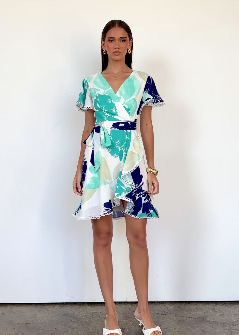 Fresh and breezy, the Mabelle Dress in teal abstract is a summer standout. Pair with tan wedges and gold hoops for garden parties, or keep it casual with slides and a bucket bag by the beach.