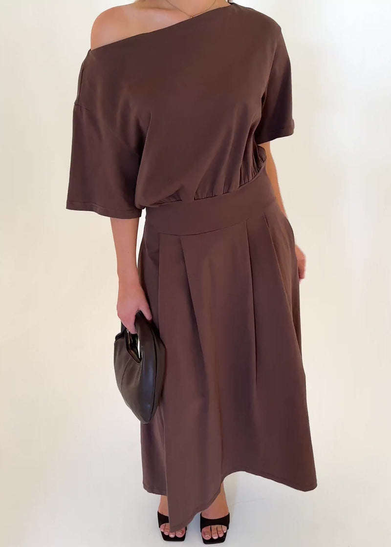 Soft, earthy tones make the Marcy Drop Shoulder Maxi Dress – Chocolate perfect for relaxed weekends, long lunches, or beachside strolls. Pair with sandals, a woven tote, and gold jewellery for an effortless warm-weather look. Add to cart and serve breezy summer charm!