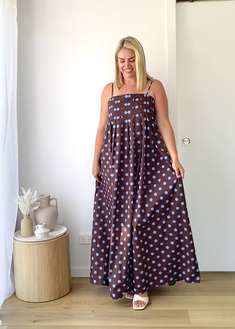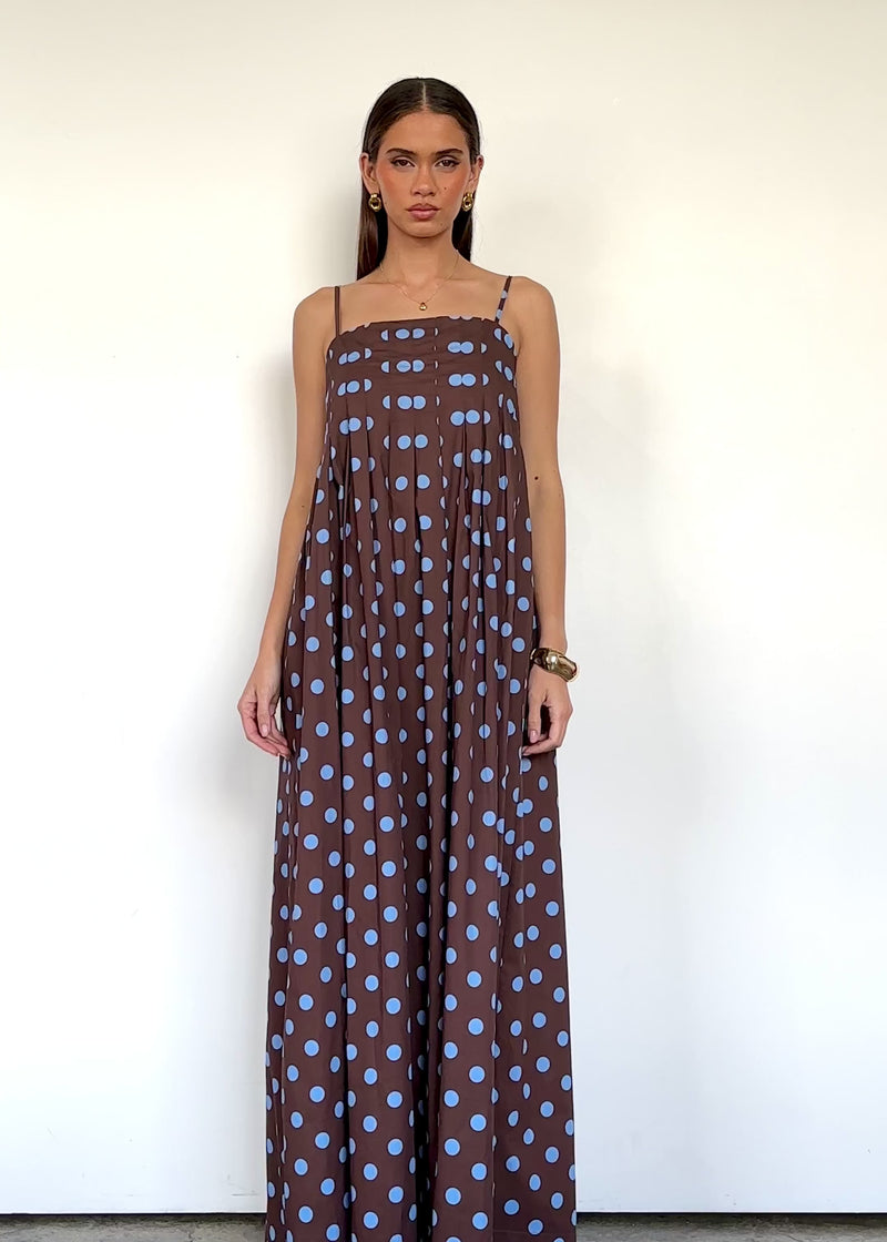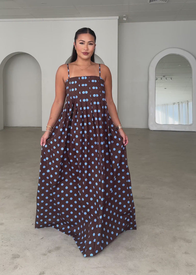 Playful and polished, the Marinella Maxi Dress in choc blue polka dot brings fun to formal. Pair with tan wedges and gold hoops for garden drinks, or switch to black heels and a red lip for event nights.