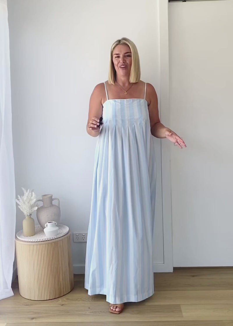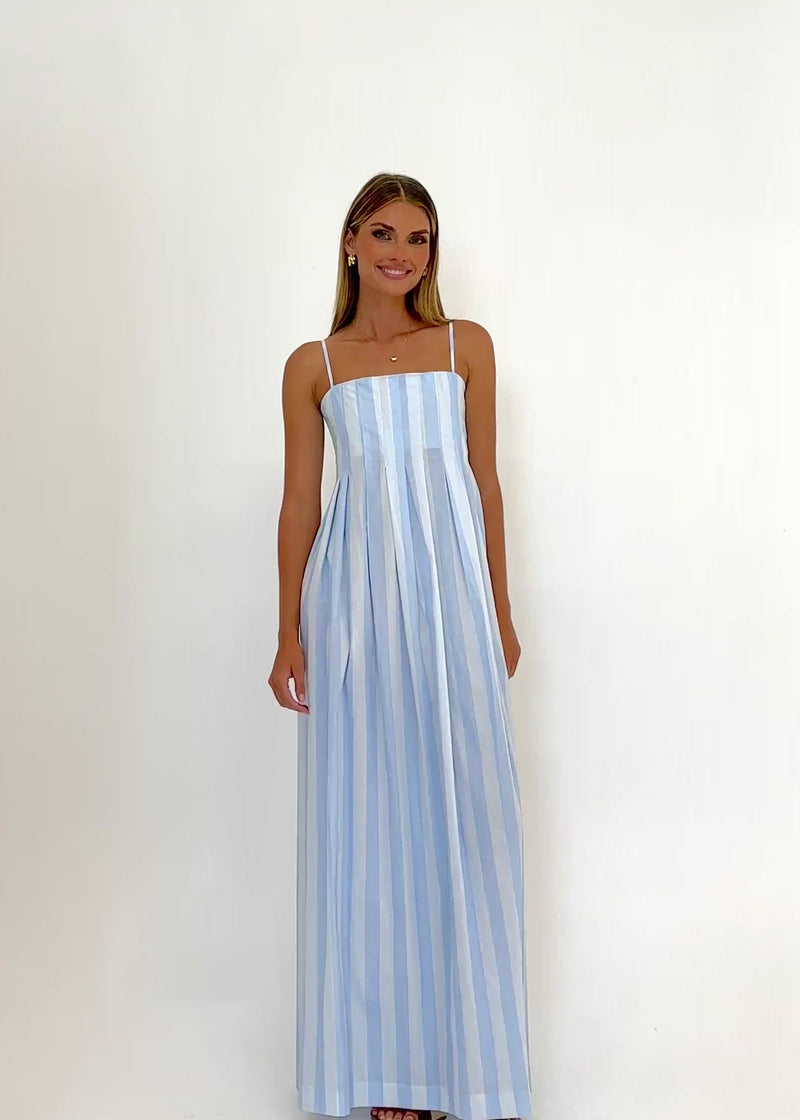 Capture a coastal aesthetic wearing Marinella Maxi Dress - Sky Stripe. Pair a refreshing blue pattern with a wide-brim hat and simple sandals for a day by the sea. A flowy fit ensures comfort during balmy afternoons. A timeless stripe design makes a dress a perfect choice for every single tropical holiday trip.