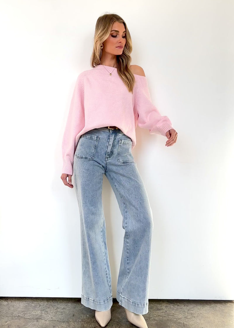 The Marsha One Shoulder Sweater in Pink is perfect for cosy but cute dressing. Tuck into high-waisted jeans or a satin midi skirt and finish with hoops and loafers.
