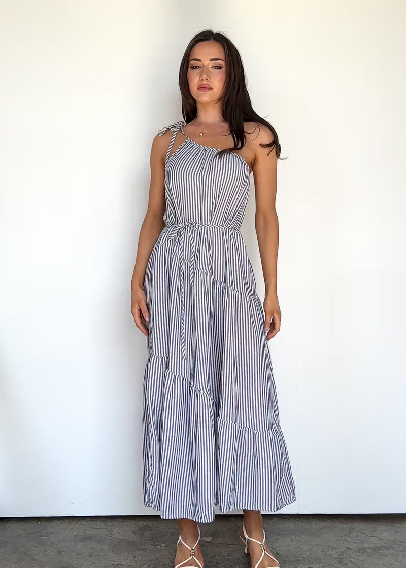 Classic and chic, the Mary One Shoulder Maxi Dress in blue stripe balances laid-back ease with elegance. Wear it with slides and a tote for coastal escapes, or pair with wedges and bold earrings for summer soirées. Effortless style that works from day to night.