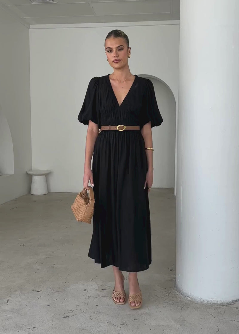 The Mecca Maxi Dress in Black is an essential for any wardrobe. Wear it with loose waves and a crystal hairpin. Add gold statement earrings, heeled sandals, and a compact clutch for a timeless evening look.